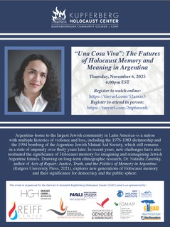 Argentina–home to the largest Jewish community in Latin America–is a nation with multiple histories of violence and loss, including the 1976-1983 dictatorship and the 1994 bombing of the Argentine Jewish Mutual Aid Society, which still remains in a state of impunity over thirty years later. In recent years, new challenges have also resituated the significance of Holocaust memory for imagining and reimagining Jewish Argentine futures. Drawing on long-term ethnographic research, Dr. Natasha Zaretsky, author of Acts of Repair: Justice, Truth, and the Politics of Memory in Argentina (Rutgers University Press, 2021), explores new generations of Holocaust memory and their significance for democracy and the public sphere.
