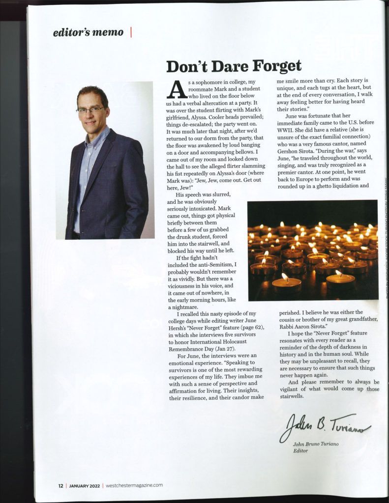 Thank you to our friends at the Westchester Magazine including June Hersh, the author of this profoundly powerful and timely article, as we prepare for our commemoration of International Holocaust Remembrance Day on January 27th.