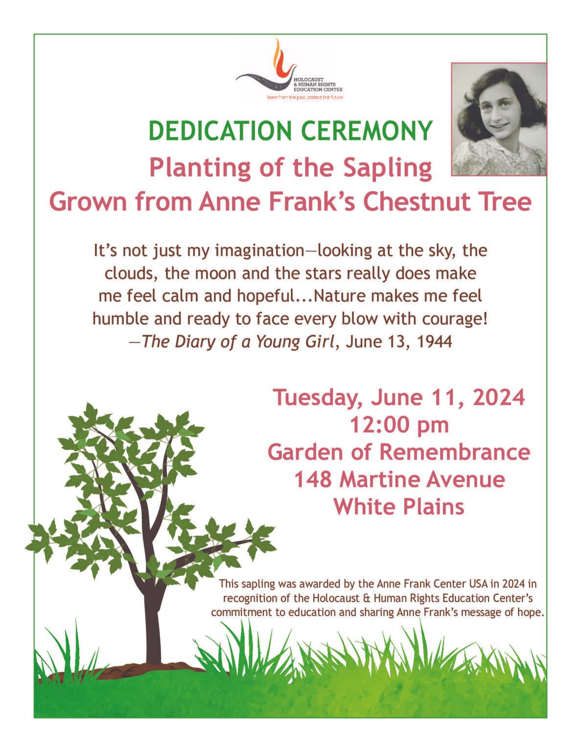 The Holocaust & Human Rights Education Center will hold a dedication ceremony on Tuesday, June 11 th at the Garden of Remembrance in White Plains, NY for the planting of a sapling grown from a tree referenced in Anne Frank’s Diary. The ceremony will begin at 12:00pm noon, and will include remarks by Westchester County Executive George Latimer and Anne Frank Center USA CEO Dr. Lauren Bairnsfather. The event is free and it is open to the public.