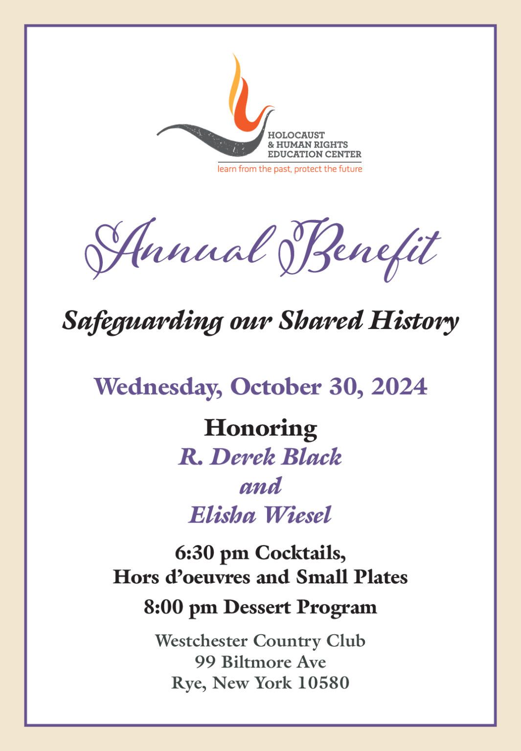 To register for this event, or for more information visit https://hhrecny.org/inspire_events/holocaust-human-rights-education-center-annual-benefit/ email benefit@hhrecny.org or call 914.696.0738.