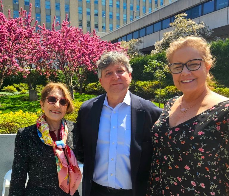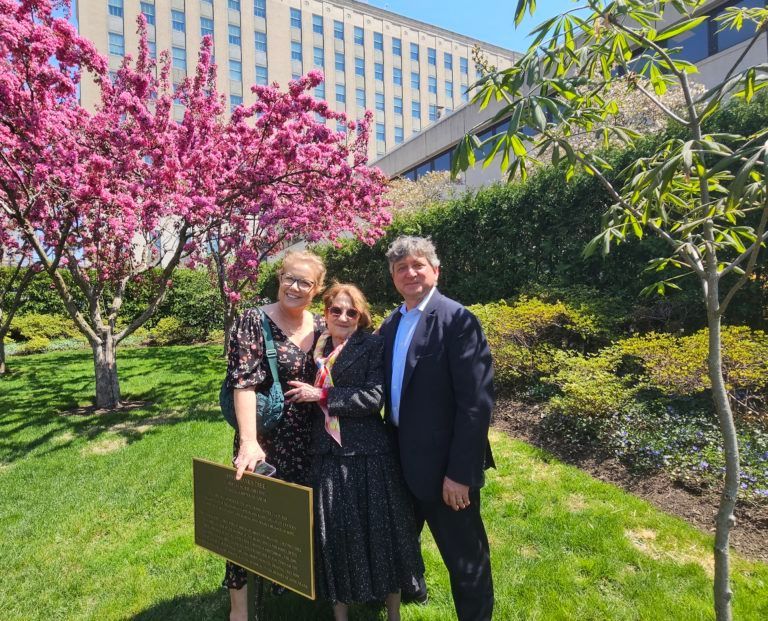 Jennifer Baker, Arlette Baker and Arnaud Baker (L to R)) standing in front of tree and plaque from sapling donated by the Anne Frank Center USA