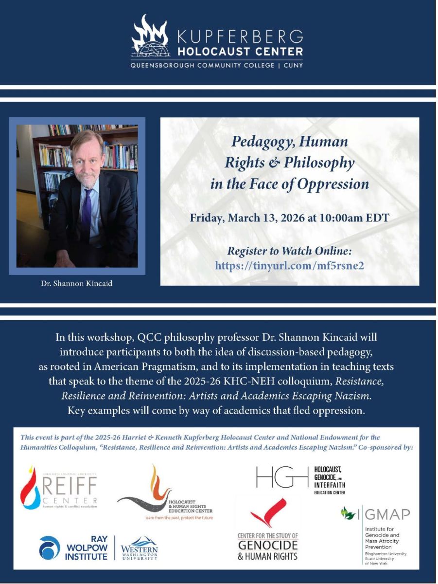 This event is part of the 2025-26 Harriet & Kenneth Kupferberg Holocaust Center (KHC) and National Endowment for the Humanities Colloquium, “Resistance, Resilience and Reinvention: Artists and Academics Escaping Nazism.” It is co-sponsored by the Center for the Study of Genocide and Human Rights at Rutgers University; the Reiff Center for Human Rights and Conflict Resolution at Christopher Newport University; the Holocaust & Human Rights Education Center in White Plains; the Ray Wolpow Institute for the Study of the Holocaust, Genocide, and Crimes Against Humanity at Western Washington University; the Holocaust, Genocide & Interfaith Education Center at Manhattan University; and the Institute for Genocide and Mass Atrocity Prevention at Binghamton University.