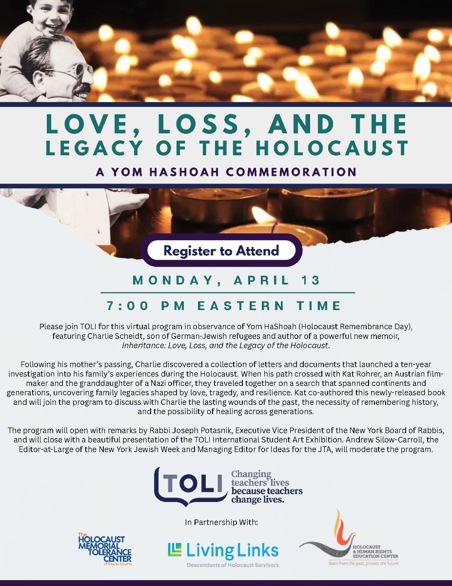 Please join TOLI for this virtual program in observance of Yom HaShoah (Holocaust Remembrance Day), featuring Charlie Scheidt, son of German-Jewish refugees and author of a powerful new memoir,Inheritance: Love, Loss, and the Legacy of the Holocaust. Following his mother’s passing, Charlie discovered a collection of letters and documents that launched a ten-year investigation into his family’s experiences during the Holocaust. When his path crossed with Kat Rohrer, an Austrian filmmaker and the granddaughter of a Nazi officer, they traveled together on a search that spanned continents and generations, uncovering family legacies shaped by love, tragedy, and resilience. Kat co-authored this newly-released book and will join the program to discuss with Charlie the lasting wounds of the past, the necessity of remembering history, and the possibility of healing across generations.