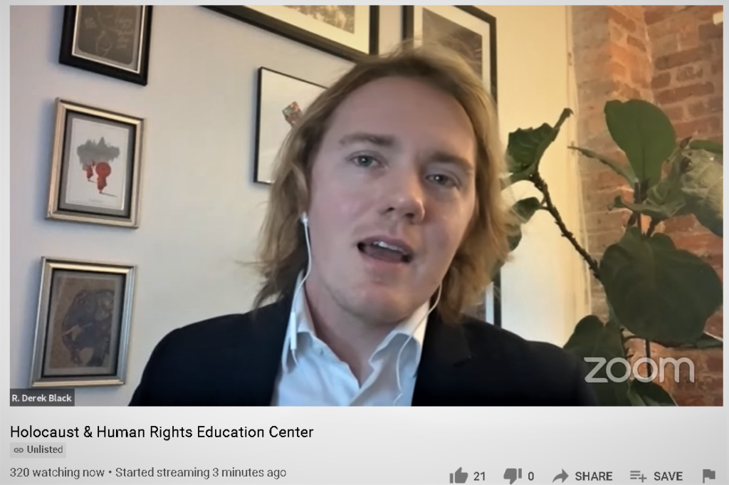 Over 600 students and teachers from 42 schools in the Westchester County NY and Fairfield County CT area attended the annual Holocaust & Human Rights Education Center (HHREC) Human Rights Institute for High School Leaders virtual event on March 18th. This year’s event featured intimate talks and testimonials by Holocaust Survivor Judith Altmann and former White Supremacist Derek Black. This event was established through partnerships between the HHREC and area schools as an educational platform to promote further awareness of human rights issues and provide instruction for students on how to empower them to take action in their schools and communities.
